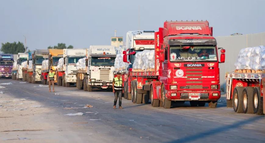 تمهيدًا للدخول إلى قطاع غزة .. تحركت الدفعة الـ139من شاحنات المساعدات من أمام معبر رفح البرى إلى معبر كرم أبوسالم، وذلك عبر البوابة الجانبية لمعبر رفح البرى، ضمن الجهود المصرية المتواصلة لتخفيف الأزمة الإنسانية الواقعة في قطاع غزة، والتى يعيشها أكثر من مليونى فلسطينى، وذلك تزامنًا مع فتح معبر رفح البرى من الاتجاهين، وتنقل الفلسطينيين بين مصر وقطاع غزة.