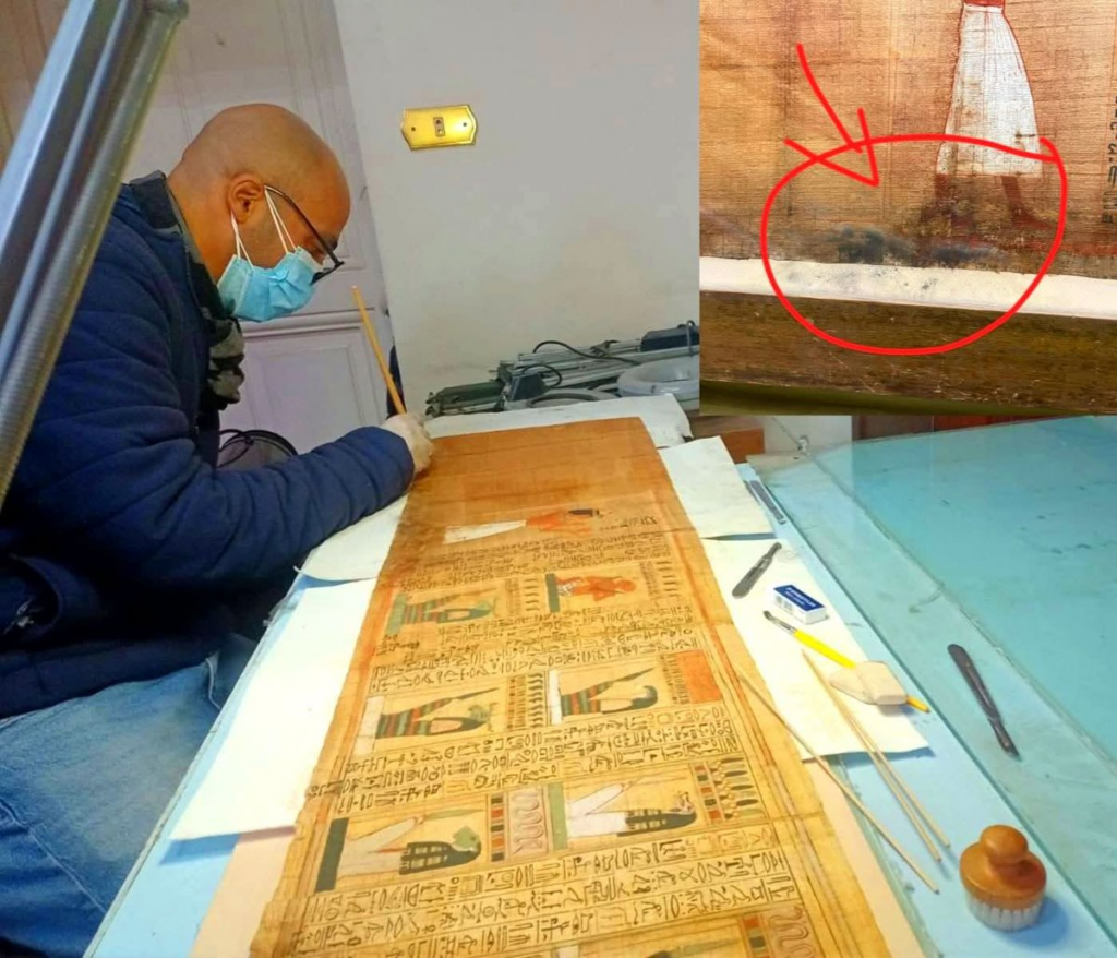 وأضاف أن البردية كانت تعاني من ظهور بعض الفطريات التي تسببت في تبقعات لونية مؤقتة ظهرت في صورة نقاط سوداء، وهي من الحالات الشائعة التي يتم التعامل معها بسهولة من خلال فرق الترميم المتخصصة، مؤكدًا أن هذه الفطريات لا تؤثر على التركيب التشريحي أو الكيميائي للمادة الأثرية.