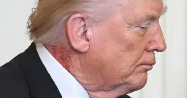 وكشفت صور مكبرة تعود على الأقل إلى زيارة ترامب إلى جورجيا في 19 فبراير إحمرارًا واضحًا على رقبة الرئيس، وأشار التقرير الطبي الصادر عن فحص ترامب الطبي في أبريل 2025، إلى أنه كان يستخدم كريم موميتازون عند الحاجة لعلاج حالة جلدية غير محددة.